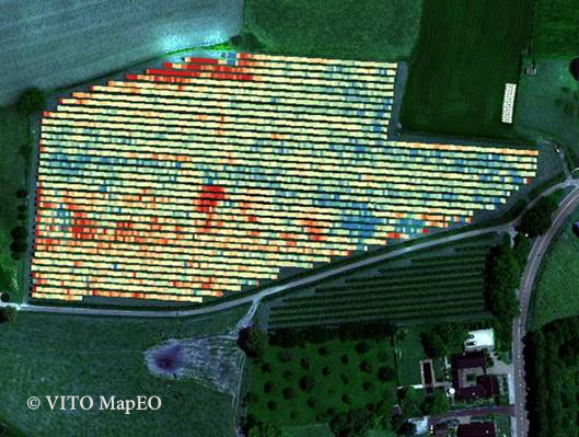 Momenteel is IFT bezig met het ontwikkelen van een ‘dashboard’ waar fruittelers makkelijk de resultaten van hun data kunnen zien die verzameld worden door drones. Ook komen er bodemkaarten en bodemscans op te staan. Voornamelijk zijn ze bezig met het weergeven van verzamelde dronedata in de mapEO-app van projectpartner VITO. MapEO zal de foto’s bewerken en doorsturen naar het ‘dashboard’ en weergeven waar het goed en slecht gaat met de percelen. Om een concreet voorbeeld te geven stuurt projectcoördinator Joke Vandermaesen mij een bewerkte foto van hoe het er gaat uitzien. Elk vierkantje is een boom en de verschillende kleuren geven de gezondheidswaarde aan. In dit geval geven blauwe en rode kleuren aan waar het beter kan, terwijl een groene kleur aangeeft waar het juist goed gaat. Om dat allemaal voor elkaar te krijgen, zijn ze aan het uitzoeken hoe ze een waarde koppelen aan de gezondheidsstatus van een boom.